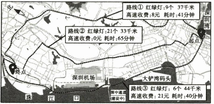家住广州南山区(起点)的小洲一家驾车前往广州宝安区的海上田园(终点)游玩,在电子地图上查询到三条路线方案,下图示意三条路线及其相关信息。读图,完成 3~5 题。