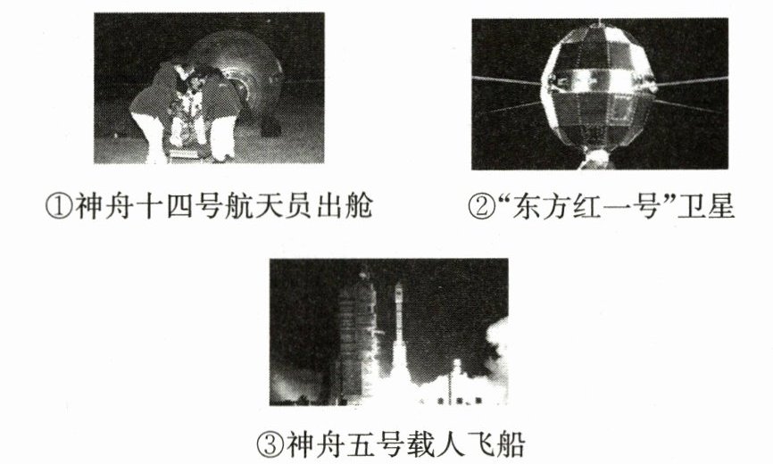 ①神舟十四号航天员出舱 ②“东方红一号”卫星 ③神舟五号载人飞船
