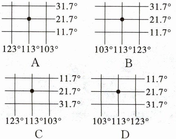 [典题1] B 根据经纬度分布规律确定经纬度,B点的经纬度位置是(21.7°N,113°E)。