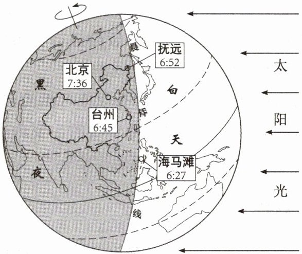 (1)题,读图可知,迎来第一缕阳光的城市及其时间分别是抚远6:52,北京7:36,台州6:45,海马滩6:27,其中最早的是海马滩。第