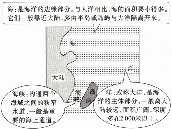 洋:或称大洋,是海洋的主体部分,一般离大陆较远,面积广阔,深度多在2 000米以上。