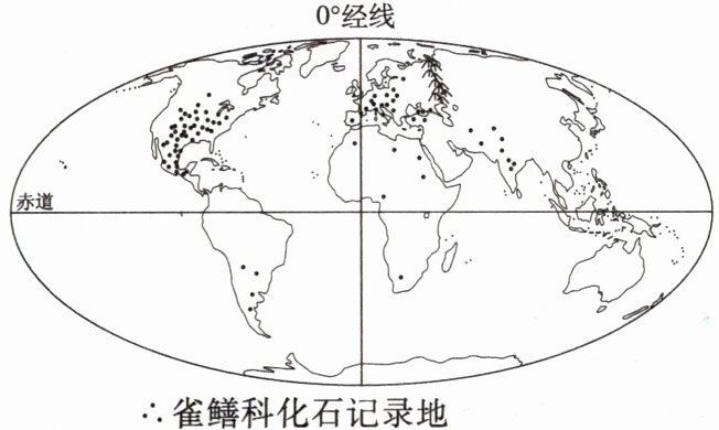 精析:读图可知,雀鳝科化石记录地主要分布在北美洲和欧洲;印度洋沿岸的雀鳝科化石比大西洋沿岸少;从南北半球来看,雀鳝科化石集中在北半球;在地球表层,陆地面积占29.2%,海洋占70.8%,陆地面积小于海洋面积。