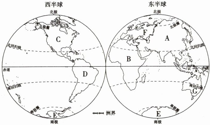 、B 非洲、C 北美洲、D 南美洲、E南极洲