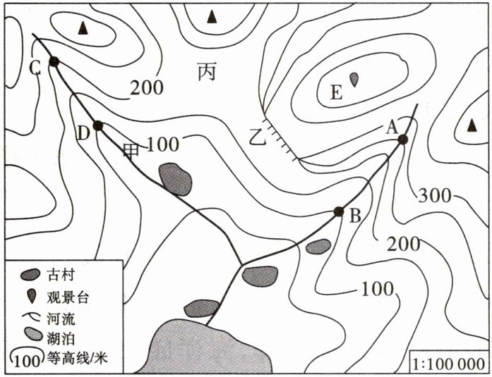 河段,判断理由是AB河段等高线较密集,坡度较大,水流速度较快