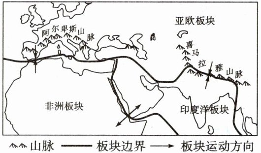 ①亚欧板块 ②非洲板块 ③碰撞挤压 ④珠穆朗玛峰“长高” ⑤相向运动 ⑥张裂拉伸