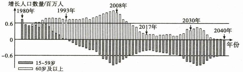 1. 该国劳动年龄人口总量开始减少出现的时间段为()