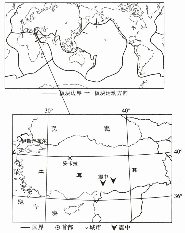 2.C 3.B 第2题,根据经纬度的递变规律判断,土耳其地震震中位置大致为(37.15°N,36.95°E)。第3题,读图可知,土耳其位于地中海—喜马拉雅火山地震带上,处于亚欧板块、印度洋板块、非洲板块三大板块的碰撞挤压地带,地壳运动活跃,地震频发。