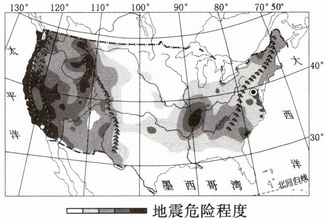 1. 下图示意美国本土地震危险程度的分布,颜色越深代表地壳运动越活跃,危险程度越高。美国本土西部地壳运动比较活跃,是因为其地处(
