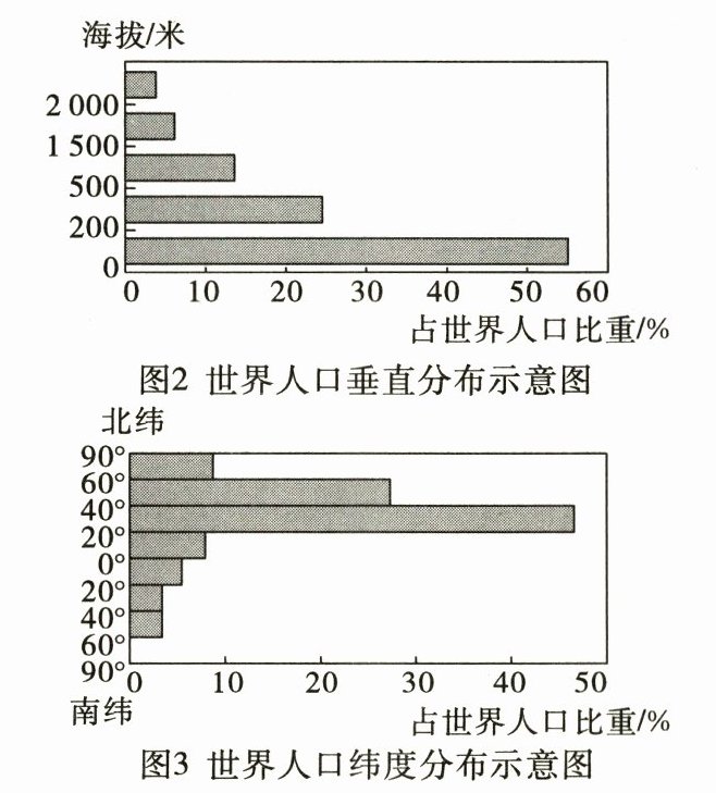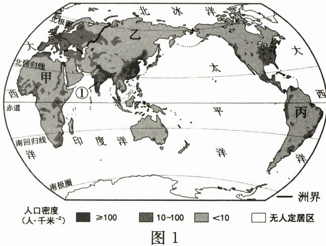 (2)图1中甲、乙、丙三地的人口分布较为(填“稠密”或“稀疏”),分析丙地人口这样分布的原因:。
