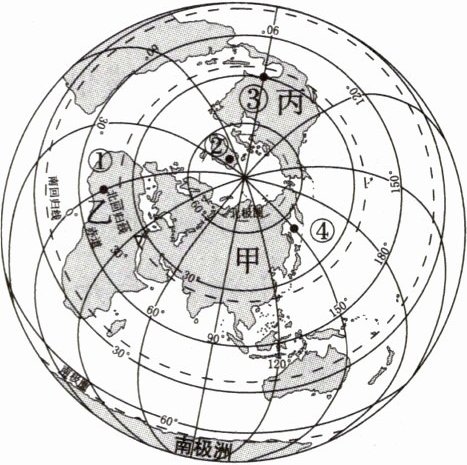 (1)题,东西半球的分界线是20°W和160°E组成的经线圈,20°W以东、160°E以西为东半球,20°W以西、160°E以东为西半球。根据四点所处的经度,可判断①④位于东半球。第