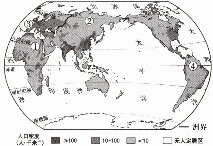 受自然环境和社会经济等因素的影响,世界人口分布很不均衡。读世界人口分布图,完成2~4题。