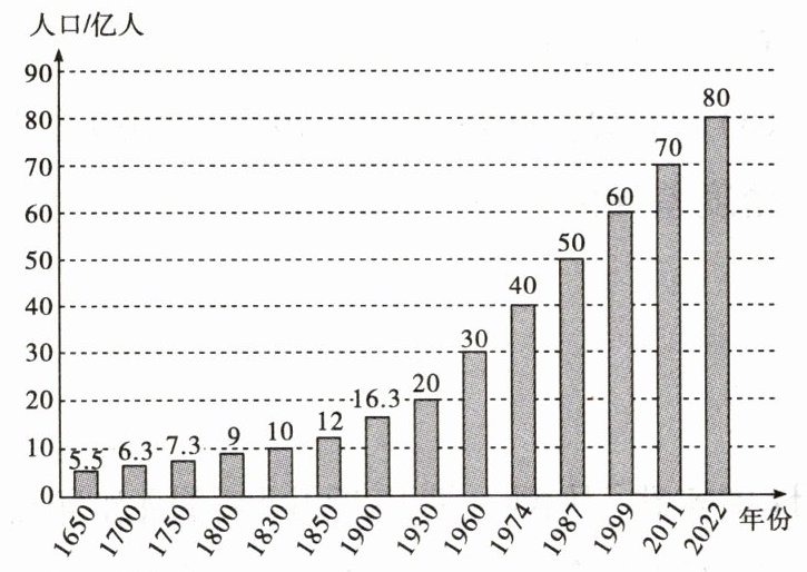 1.C 读图可知,目前世界人口超过80亿;1650年至1800年人口增长缓慢,1800年以后人口增长较快;大致每增加10亿人口所用时间越来越短。