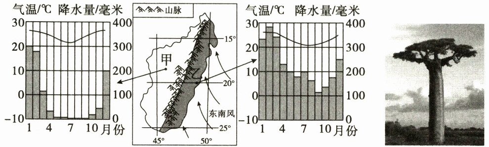 第16题,由材料可知,猴面包树树干粗大,喜温耐旱,干季时落叶以减少水分蒸发,湿季时可大量储水于树干中。据猴面包树的生长习性,推断其分布在终年高温,降水年内分布不均匀的热带草原气候区。 读图可知,甲地为热带草原气候,乙地为热带雨林气候。 第17题,读材料可知,甲地为热带草原气候,乙地为热带雨林气候,猴面包树主要分布在热带草原气候区,故分布在甲地。 图中景观拍摄于湿季,甲地12月到次年的2月降水多,为湿季,故选2月。 第18题,由图可知,该岛屿盛行风向为东南风,甲地主要位于东南风的背风坡,降水少,形成了热带草原气候;乙地位于东南风的迎风坡,降水充沛,形成热带雨林气候。