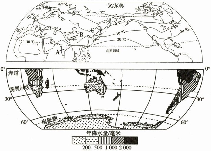 (1)世界各地气温差异显著,图中 A 和 C 两地年平均气温相差较
