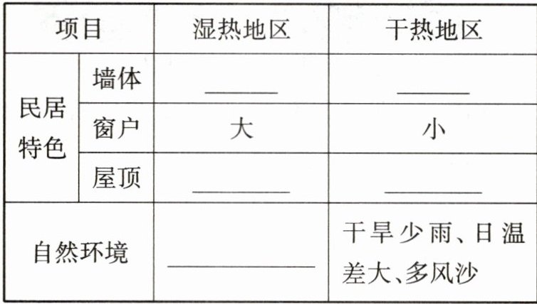 (1)题,读材料可知,吊脚楼是我国南方地区的建筑,适合湿热的气候环境,吊脚楼屋顶坡陡,便于排水;墙体厚实、利于保暖应该是我国北方地区的民居特点;窗户较小,是为了减少阳光的照射;吊脚楼的修建是就地取材,当地竹木材料丰富。第