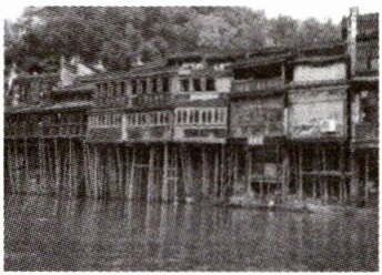 “茶峒地方凭水依山筑城……贯串各个码头有一条河街,人家房子多一半着陆,一半在水,因为余地有限,那些房子莫不设有吊脚楼……”读吊脚楼景观图,完成(1)~(2)题。