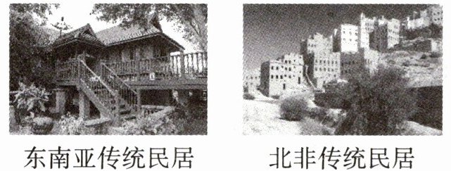 1. 读图,分别说出东南亚和北非传统民居的特色。