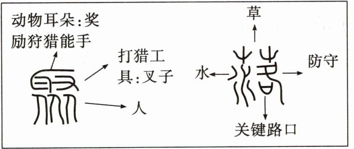 [跨学科语文]《桃花源记》中这样描写桃花源:“土地平旷,屋舍俨然,有良田、美池、桑竹之属。阡陌交通(田间小路交错相通),鸡犬相闻……”读甲骨文“聚”和“落”的解释示意图,完成8~9题。