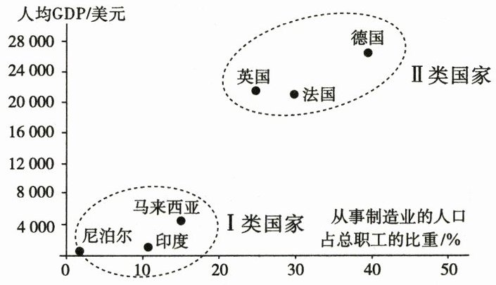 10.D 11.C 第10题,据图可知,发达国家人均GDP高,发展中国家人均GDP低,发达国家从事制造业的人口比例高,发展中国家从事制造业的人口比例低。 第11题,发展中国家与发达国家之间关于经济、政治等方面问题的商谈,叫作“南北对话”。发展中国家之间的互助合作,称为“南南合作”。Ⅰ类国家是指发展中国家,Ⅱ类国家是发达国家,两类国家之间的会谈属于“南北对话”。