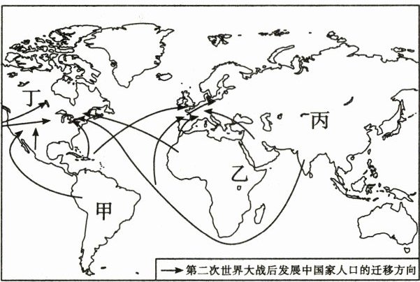 读第二次世界大战后发展中国家人口的迁移方向示意图,完成7~9题。