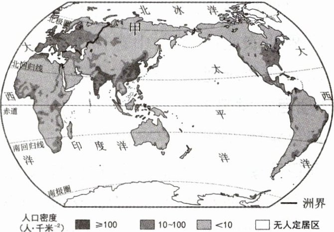 [典题1](1)B (2)D 第(1)题,结合图例读图可知,亚洲东部和南部、欧洲西部、北美洲东部、南美洲东南部人口稠密。第(2)题,甲地位于寒冷的极地,人口稀少。