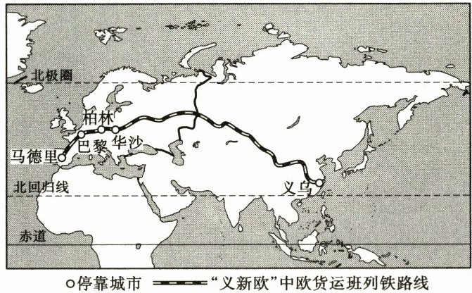 中国秉承合作共赢、共同发展的思想,加快亚太经济圈与欧洲经济圈的互通互联。下图示意“义新欧”中欧货运班列铁路运输路线。