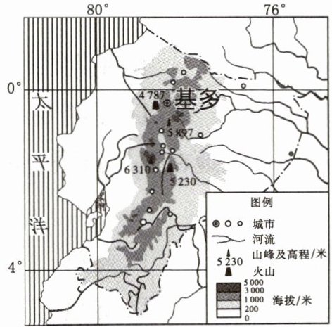 (2023陕西)天文观测的最佳地点一般选择在视野开阔、大气透明度高且靠近赤道的地方。厄瓜多尔首都基多是世界顶级观星胜地之一。读厄瓜多尔简图,完成(1)~(2)题。