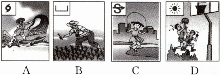 3. 说出下列各图中天气符号的名称,并判断人们所进行的活动是否妥当。