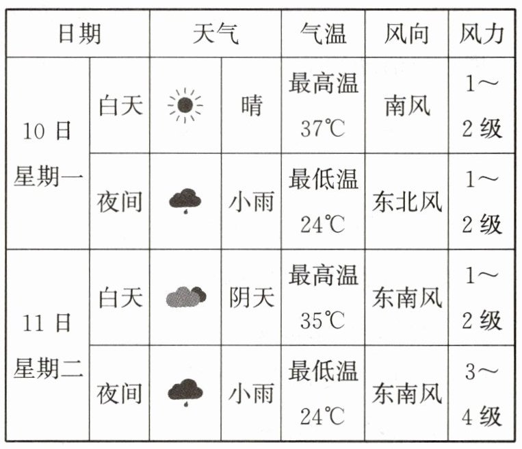 2. 下表是北京某两日的部分天气预报信息。说一说,天气预报中一般会涉及哪些要素?