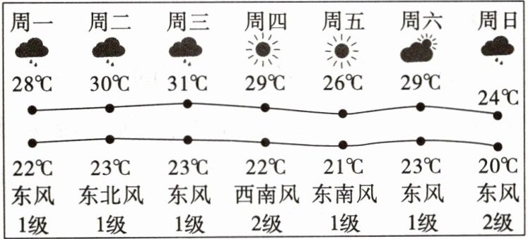8.D 9.A 第8题,读图可知,图A表示东北风2级,图B表示西南风4级,图C表示东北风3级,图D表示西南风2级。第9题,由材料可知,未来一周该市天气大部分是中雨和多云,晴天少,阴雨天气为主;未来一周最低温在20℃以上,天气炎热;风力大多为1~2级,风力小。
