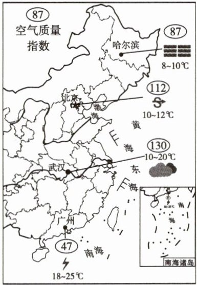 6.A 7.C 第6题,读图可知,北京为沙尘暴天气;武汉为阴天,最低气温10℃,最高气温20℃;广州为雷电天气。第7题,读图可知,该日北京为沙尘暴天气,应建议当地居民出门戴口罩防沙尘。