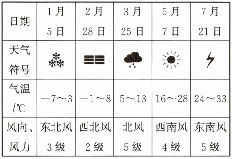 (5)题,从表中可知,1月5日的天气符号表示大雪,可以堆雪人;5月7日的天气符号表示晴,适合野外踏青等。