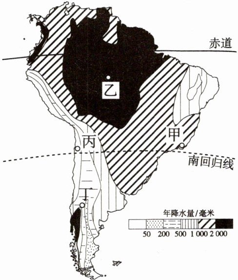 (2)题,世界降水的分布规律是赤道地区降水多,两极地区降水少;中纬度沿海地区降水多,内陆地区降水少;回归线附近大陆东岸降水多,西岸和内陆降水少;山地迎风坡降水多,背风坡降水少。图示甲地位于南回归线附近的大陆东岸,丙地位于南回归线附近的大陆西岸,两地降水差异大。