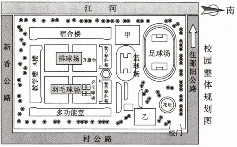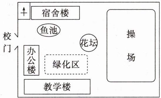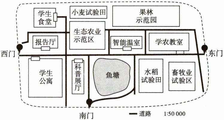 (2)题,根据图示“西门”“南门”“东门”可判断方向,距离鱼塘南边最近的是南门,学农教室在学生公寓的东北方向。第