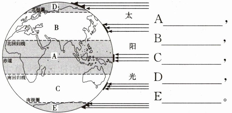 、是否有极昼和极夜现象,将地球表面划分为“五带”。写出下图中地球五带的名称:A