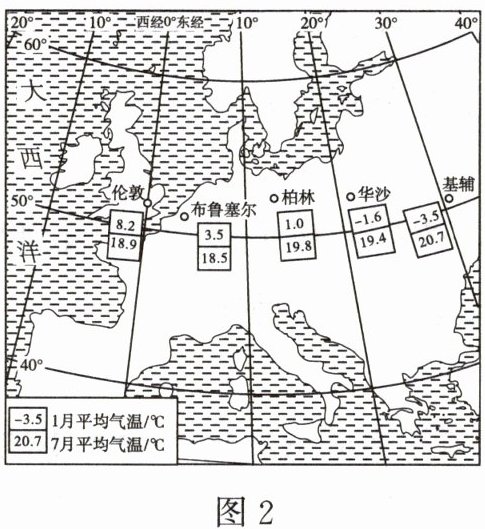 (3)受海陆位置的影响,描述图2中五个城市自西向东的气温变化规律。