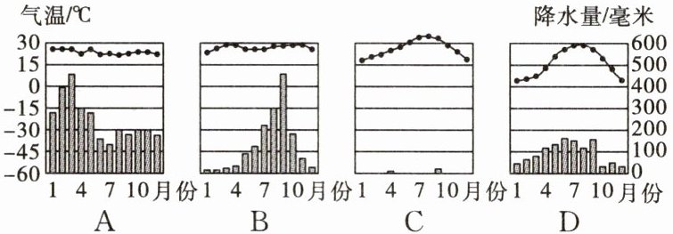 (1)题,读图可知,该地一年到头都很热,天天下雨,气候特征是全年高温多雨,气温年较差小,属于热带雨林气候,A图符合题意。第