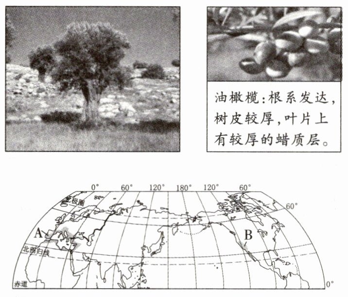 (3)题,地中海气候区的植被主要为亚热带常绿硬叶林。为了适应夏季炎热干燥的气候特点,油橄榄树叶表面有一层“蜡质层”,其主要作用是减少水分蒸腾。