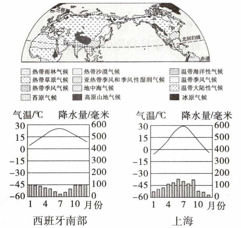 3.C 4.A 第3题,读西班牙南部气候资料图可知,该地7、8月份炎热干燥,易引发森林火灾。第4题,西班牙南部为地中海气候,夏季炎热干燥,冬季温和多雨;上海为亚热带季风和季风性湿润气候,一年内风向随季节变化明显,最冷月平均温度在0℃以上,四季分明,夏季高温多雨(雨热同期);两地共同的气候特点为夏季高温,冬季温和。