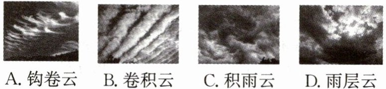 。(填写字母代号)A. 钩卷云 B. 卷积云 C. 积雨云 D. 雨层云