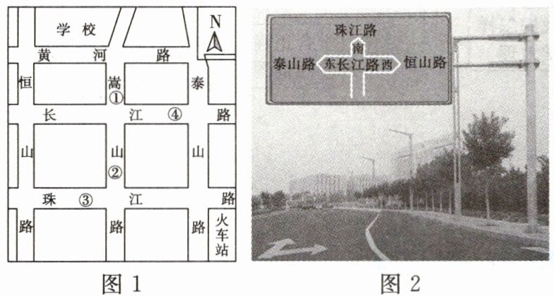 2.A 读图2可知,前方是长江路,在小明的东侧是泰山路,西侧是恒山路,可知小明位于南北方向的嵩山路上,所以小明拍摄照片的位置可能是图1中①地。