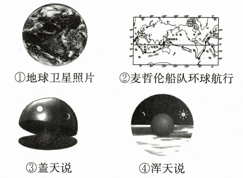 第3题,结合材料和所学知识可知,人类对地球形状的探索过程依次是③盖天说→④浑天说→②麦哲伦船队环球航行→①地球卫星照片。第4题,麦哲伦船队的环球航行首次证实了地球是一个球体。