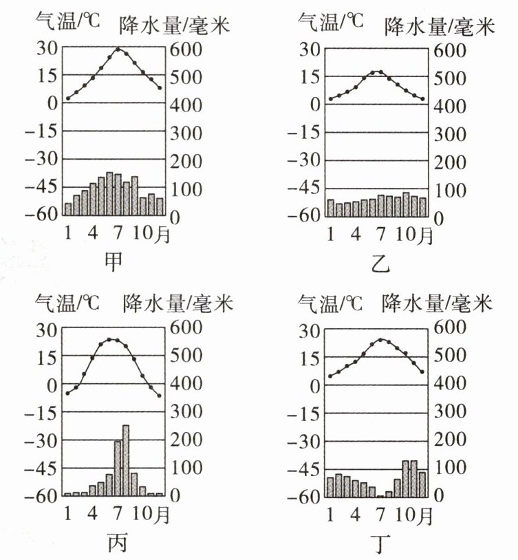 (2)甲、乙、丙、丁四地中,降水季节分配比较均匀的是