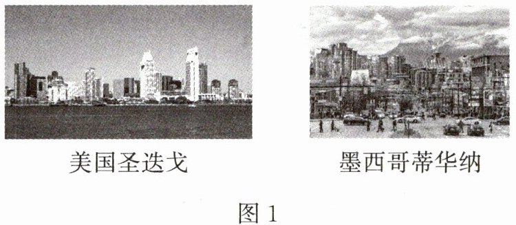 国家。2. 说出美墨边境两个城市的主要地理景观差异。
