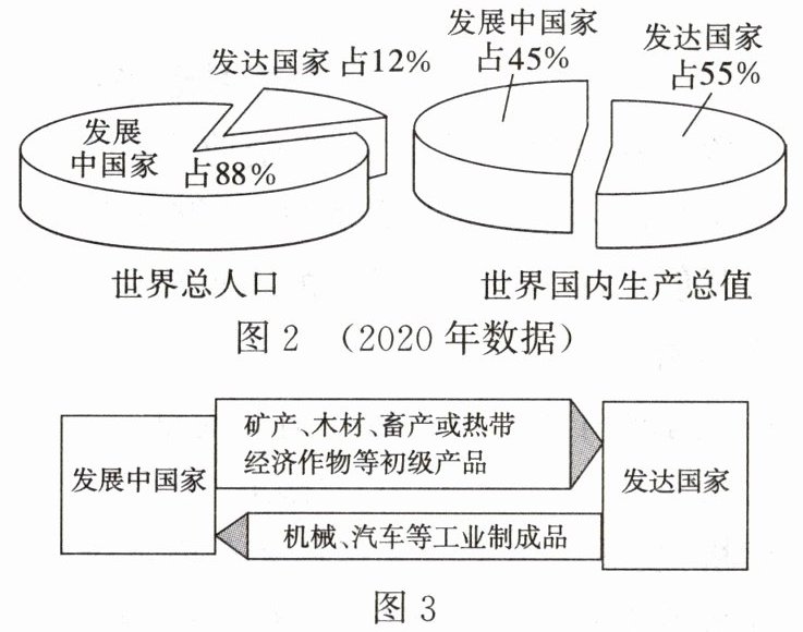 3. 读图2,比较发展中国家和发达国家的人口与国内生产总值。