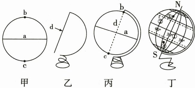 7. 丁图为某同学自制的地球仪,关于图中经纬线的说法,错误的是 (