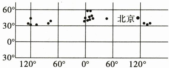读下面历届冬奥会举办城市位置示意图,完成 9~10 题。
