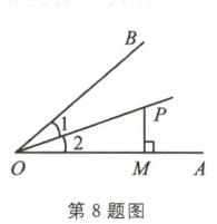 8. 如图,$\angle 1 = \angle 2$,$PM\perp OA$于点$M$,则$P$点到$OB$的距离等于(