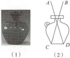 4. 图(1)是铺首纹盘口壶,其结构示意图如图(2)所示。为了测量其底部内径$CD$,考古学家将两根细木条的中点固定在一起,量出$A$,$B$两点之间的距离,即可得到$CD$的长度,其依据的数学基本事实是(