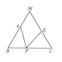 如图,在等腰$\triangle MBC$中,$MB = MC$,点$A,P$分别在$MB,BC$上,作$\angle APE = \angle B$,$PE$交$CM$于点$E$.
